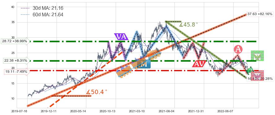 ♘ 阻力价格位22.38,可信任强度87.00%,距离最后交易2022-08-12形成的收盘价格20.66相差 +8.31%
