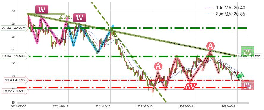 ♘ 支撑价格位19.40,可信任强度67.45%,距离最后交易2022-08-12形成的收盘价格20.66相差 -6.11%