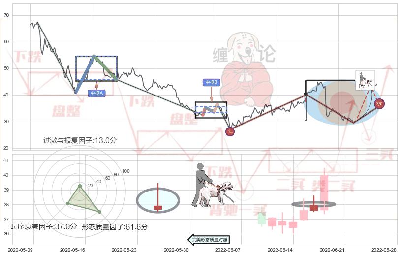 从2021-02-10至2022-04-13,共包含281个交易日,阶段股价下跌-80.97%,阶段股价变动位移路程比: 1 : 8,下跌趋势角度: 58.8,2021-06-24向↘︎形成缺口,跳空下跌-24.42%˚