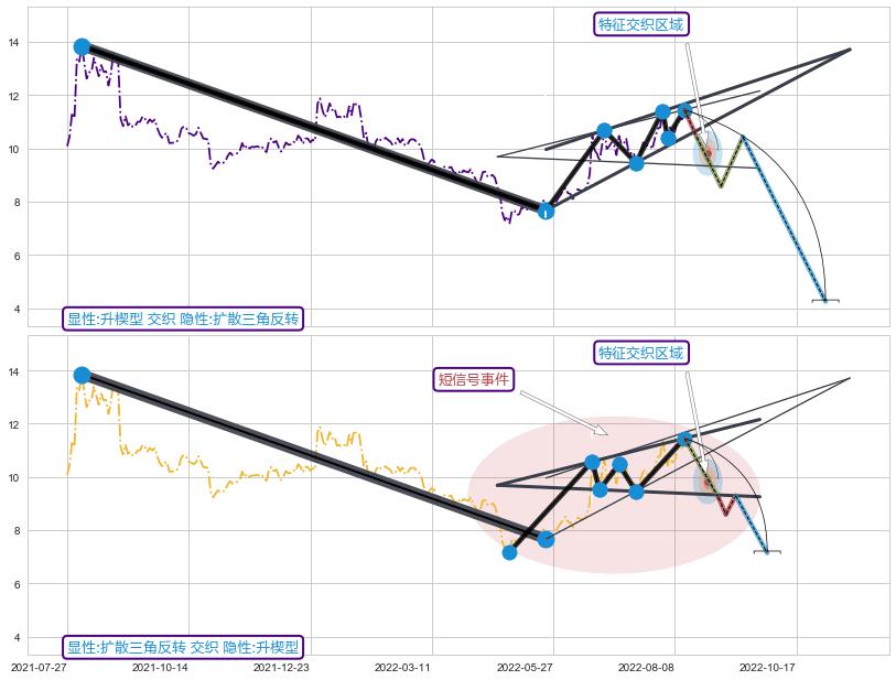 ➣ 扩散三角反转:猜想临近关键支撑位突破点 → 临近拐点下跌 → 风险信号 → 大趋势均值回复
