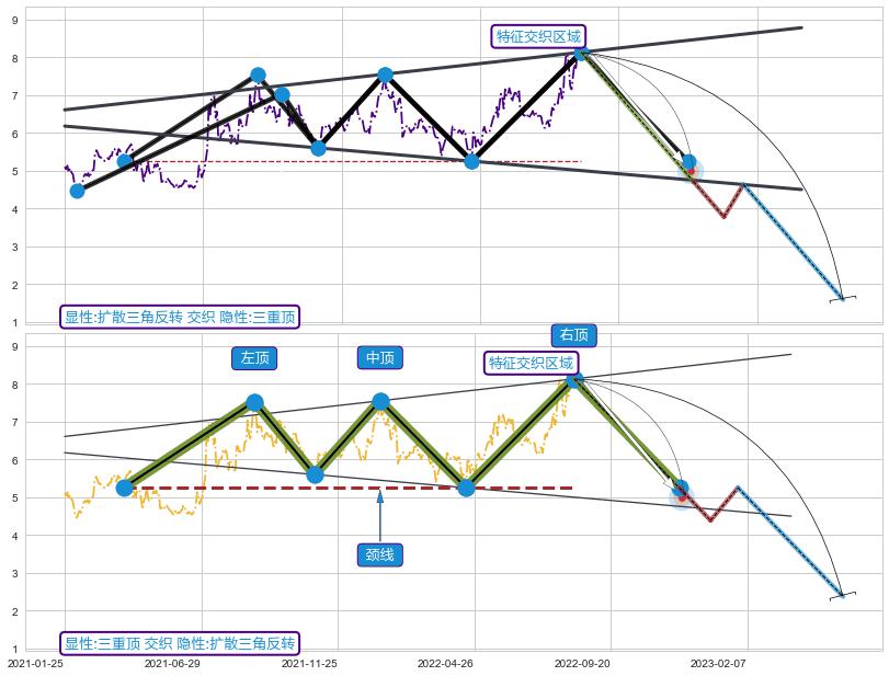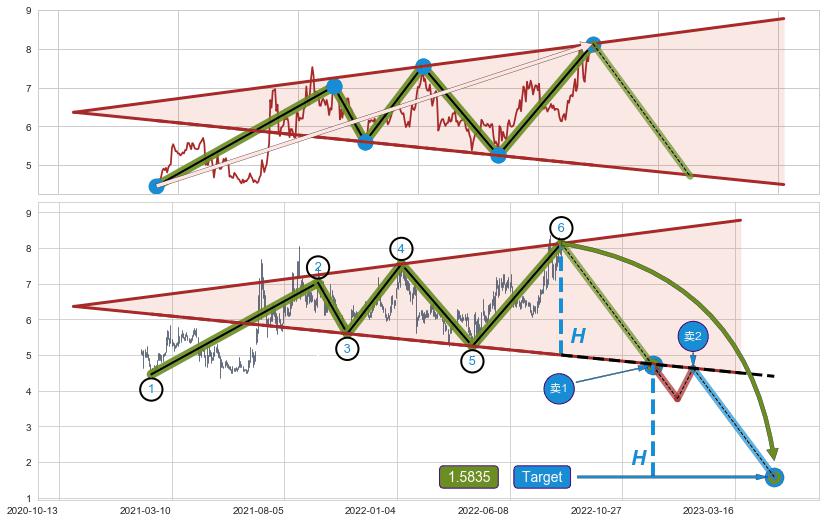 ➣ 扩散三角反转:猜想临近关键支撑位突破点 → 临近拐点下跌 → 风险信号 → 大趋势均值回复