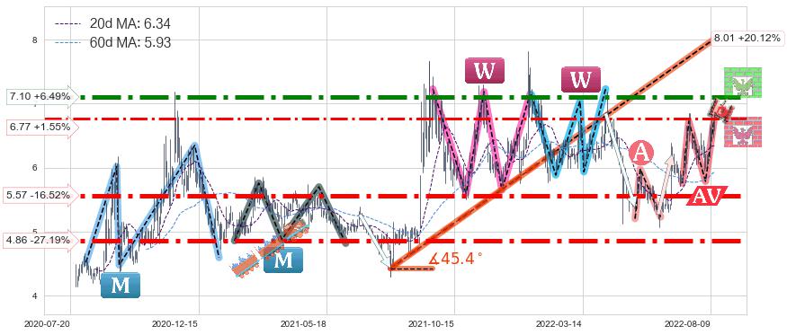 ➢ 【仅预测突破】最后价格:6.67与预测突破价格:6.19→【空间较大】后续最小【整理】第一目标价格→(2022-10-14: 4.91 )