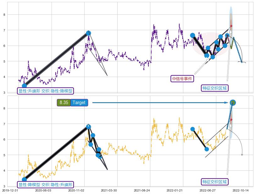 ➣ 升旗形:猜想临近关键支撑位突破点 → 临近拐点下跌 → 风险信号 → 大趋势均值回复