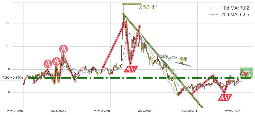 2021-08-17: 第一阻力位7.26有效抑制了下跌浪,成功阻止了价格的继续下跌。
