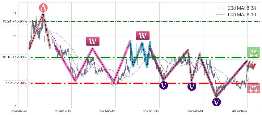 ♘ 支撑价格位7.95,可信任强度92.69%,距离最后交易2022-08-12形成的收盘价格9.07相差 -12.30%