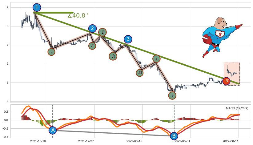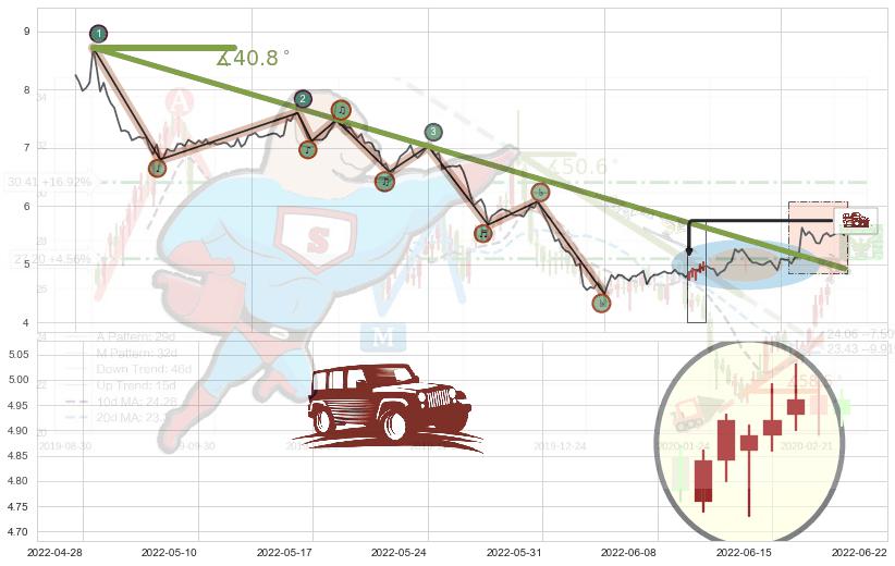 ➣ 2021-09-23-2022-05-20下跌趋势存在反转上涨[机会],其原下跌趋势的阻力位(4.93)已被突破[强支撑信号],原下跌趋势角度: 40.8˚