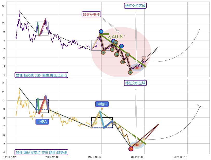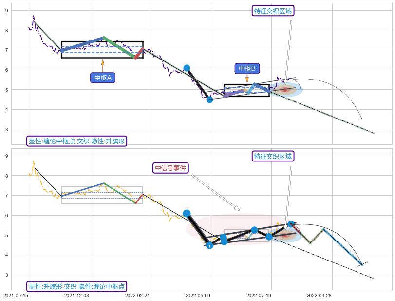 ➣ 下跌身怀六甲 + 缠论中枢点破位中枢B支撑下拉信号叠加后【信号初始稳固度】高,【看空】信号叠加【可信度影响大】
