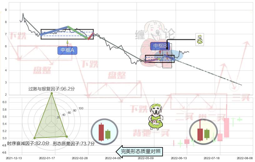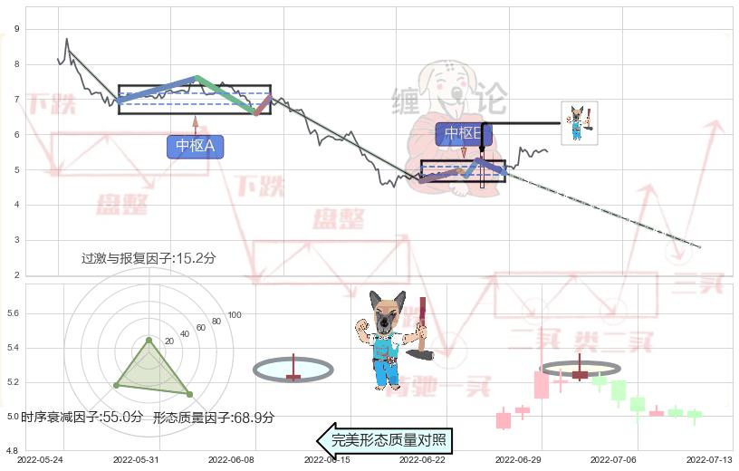 ➣ 【中枢B】:2022-05-24-2022-07-15,中枢由5笔构成,共38交易日, ZG=4.97, ZD=4.90