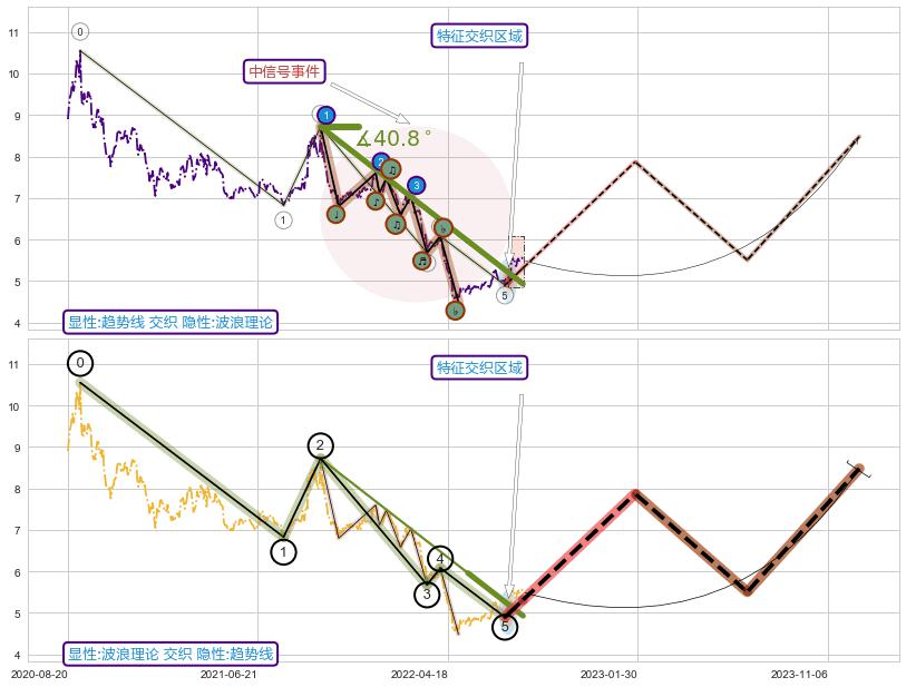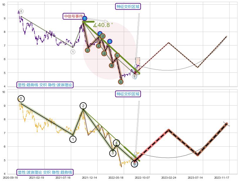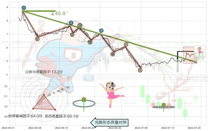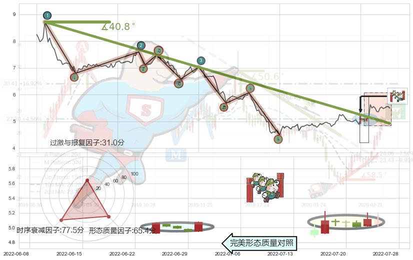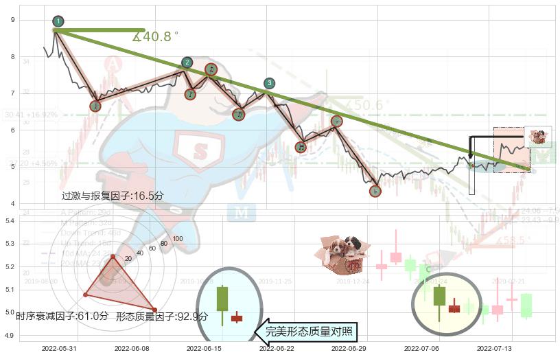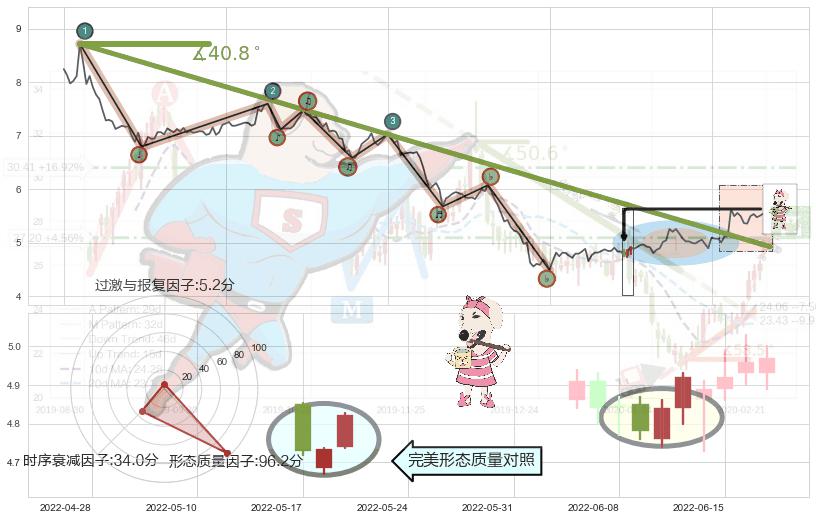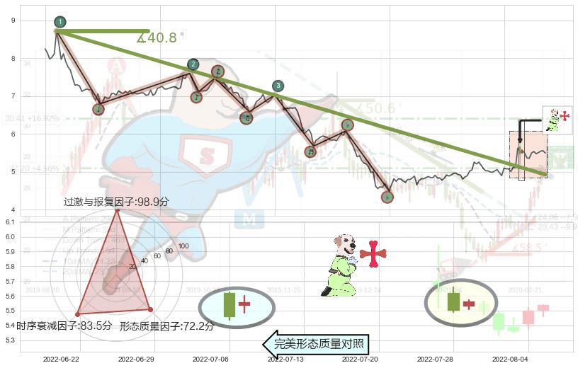 ➢ 2021-09-23-2022-05-20下跌趋势存在反转上涨[机会],其原下跌趋势的阻力位(4.93)已被突破[强支撑信号],原下跌趋势角度: 40.8˚
