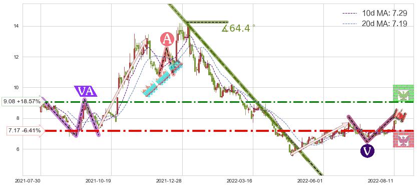 ♘ 支撑价格位7.17,可信任强度75.18%,距离最后交易2022-08-12形成的收盘价格7.66相差 -6.41%