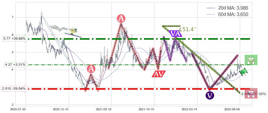 ♘ 阻力价格位5.77,可信任强度93.61%,距离最后交易2022-08-12形成的收盘价格4.13相差 +39.68%