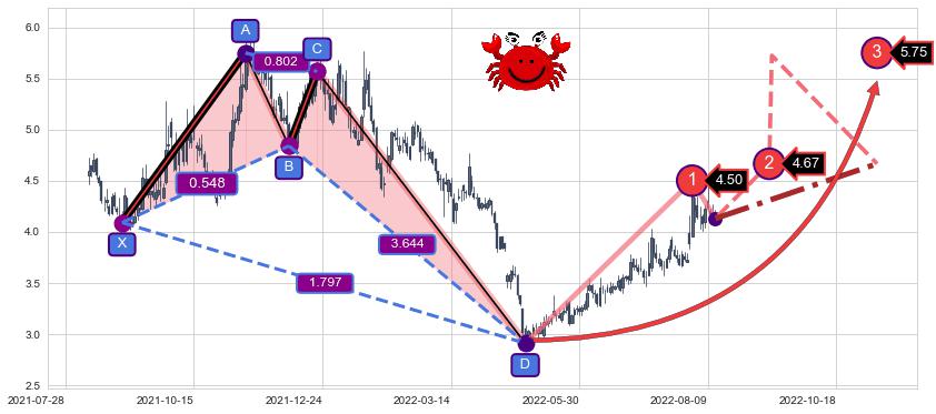 ➢ 谐波螃蟹:c下跌到达d:猜想拉升 → 上涨 →【拐点】强支撑临近 → 大趋势均值回复