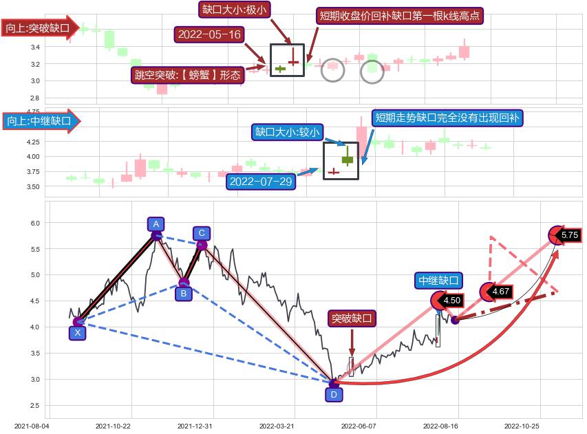 ➣ 突破缺口形成后,后续k已经超过14根,跳空突破【螃蟹】形态关键点后, 出现【深度回踩】迹象,短期低点影线回补缺口第一根k线高点