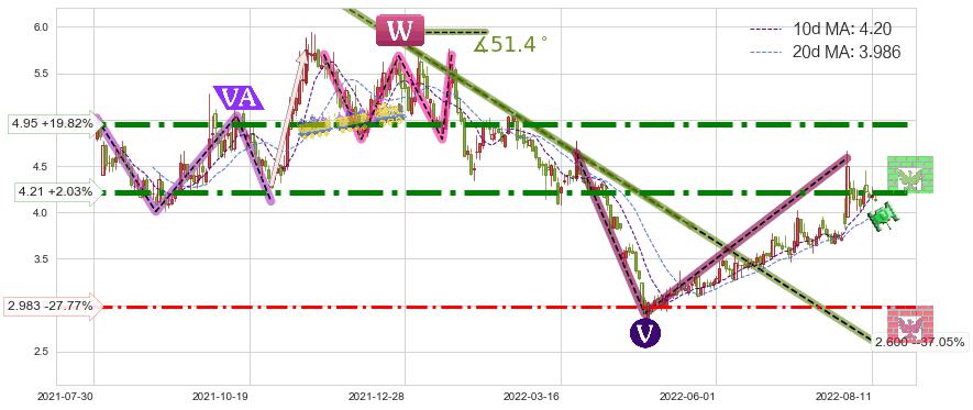 ♘ 阻力价格位4.21,可信任强度89.89%,距离最后交易2022-08-12形成的收盘价格4.13相差 +2.03%