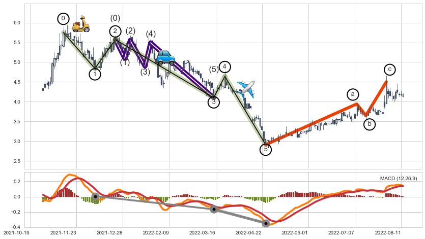 ➣ 波浪理论:猜想达到c点后小反弹终止反转下跌 → 下跌 → 【拐点】临近 → 阶段均值回复结束后继续大周期趋势跟踪
