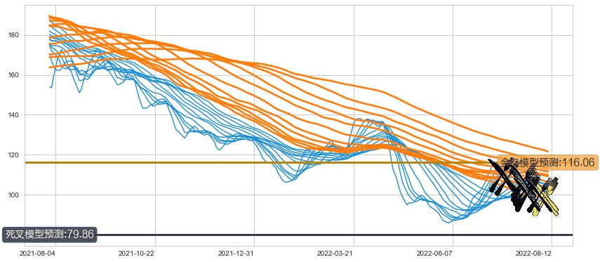 ➢ 60小时均线于(2022-08-05: 99.47)形成【死叉】基于【死叉历史模型】预测死叉后最低波谷价格: 77.27, 死叉后最低价格92.93,尚未达到预测最低波谷价格, 预期继续下跌