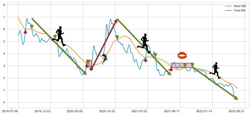2021-10-20至2022-06-21 慢线与快线呈空头排列, 慢线与快线接触少,无缠绕