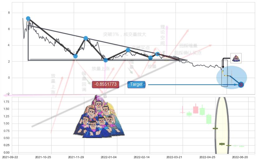 ➣ 下降三角整理:猜想预期下跌目标target即将达成,随后猜想强支撑来临,预期反弹上涨(均值回复)