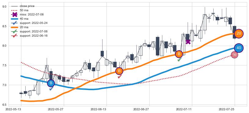 ➢ 40小时均线于(2022-05-24: 7.04)形成【金叉】基于【金叉历史模型】预测金叉后最高波峰价格: 9.69, 金叉后最高价格8.83,尚未达到预测最高波峰价格, 预期继续上涨