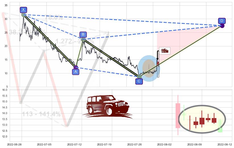 ➢ 谐波赛福:b持续蓄力下跌击穿越过c:猜想报复性拉升 → 上涨 →【拐点】强支撑临近 → 大趋势均值回复