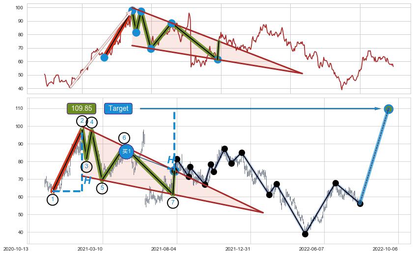 ➣ 降楔型:猜想预期上涨目标target即将达成,随后猜想强阻力来临,预期回调下跌(均值回复)