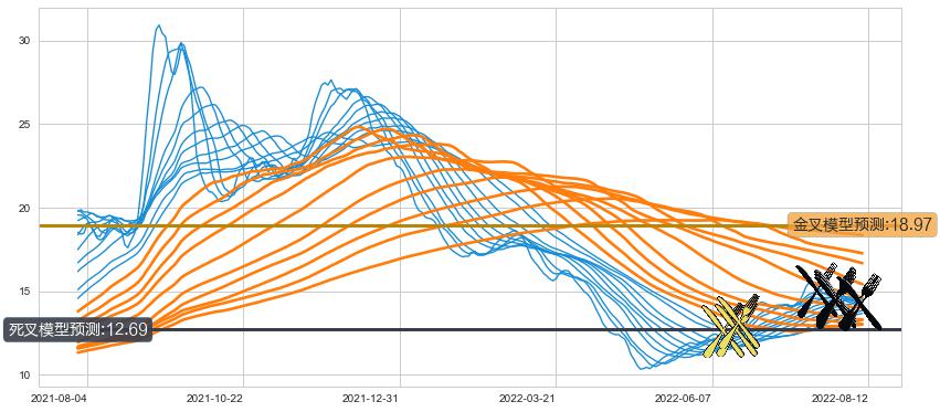 ➢ 40小时均线于(2022-08-10: 14.30)形成【死叉】基于【死叉历史模型】预测死叉后最低波谷价格: 12.36, 死叉后最低价格13.84,尚未达到预测最低波谷价格, 预期继续下跌