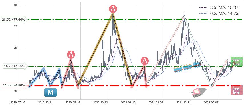 ♘ 阻力价格位15.72,可信任强度58.07%,距离最后交易2022-08-12形成的收盘价格14.93相差 +5.26%