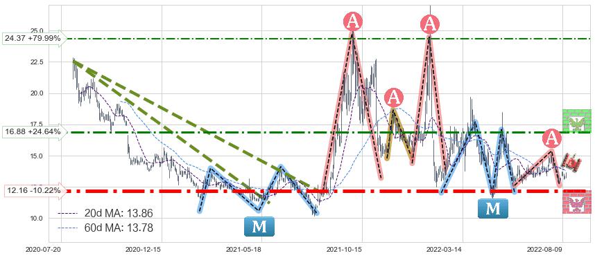 ♘ 阻力价格位16.88,可信任强度65.22%,距离最后交易2022-08-12形成的收盘价格13.54相差 +24.64%