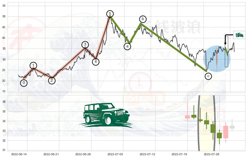 ➢ 波浪理论:猜想击穿破位c点后继续下跌 → 下跌 → 风险信号 → 小趋势跟踪