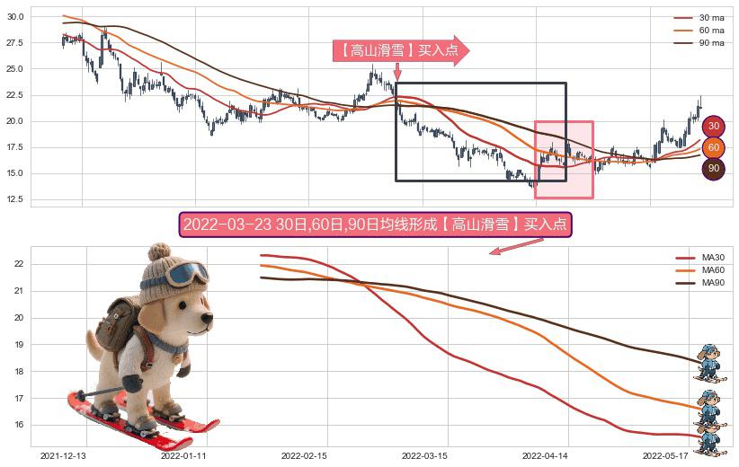 ⚀ 2022-01-24日-2022-05-19日显现 30日-60日-90日均线 【高山滑雪】买入点 看多信号,后市看涨,买入