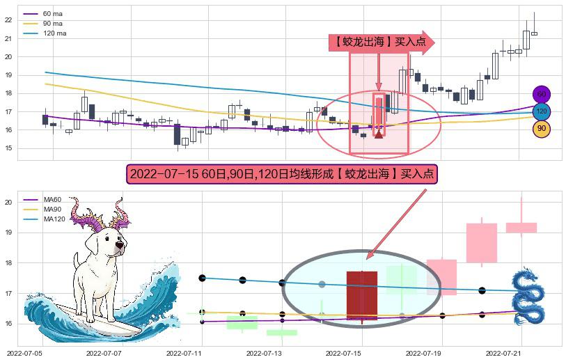 ⚀ 2022-07-15日显现 60日-90日-120日均线 【蛟龙出海】买入点 看多信号,后市看涨,买入