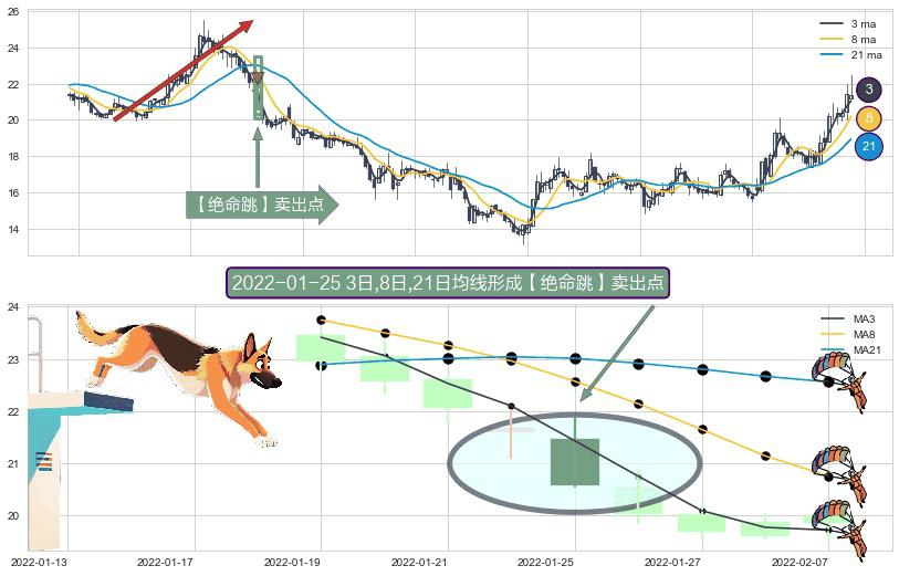 ⚀ 2022-01-25日显现 3日-8日-21日均线 【绝命跳】卖出点 看空信号,后市看跌,卖出