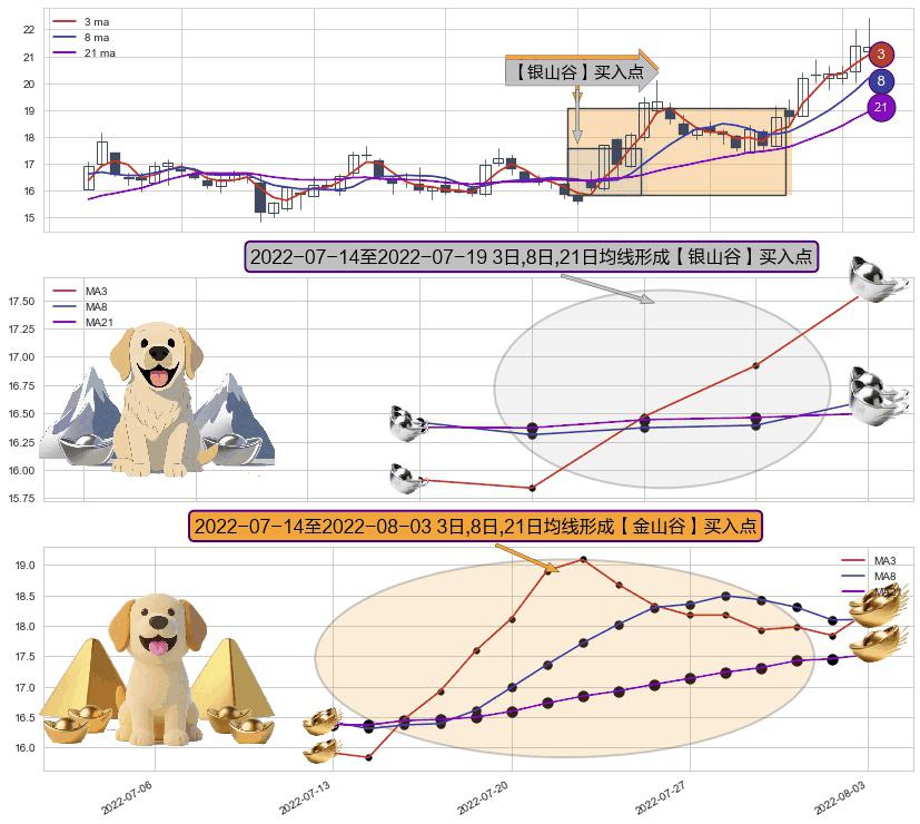 ⚃ 2022-07-15-日至2022-08-03-日显现 3日-8日-21日均线 【金山谷】买入点 其再次确认了买入信号,可靠性更强,买入