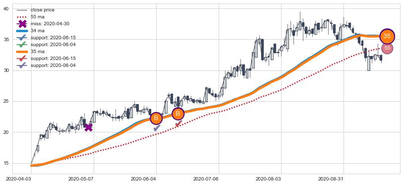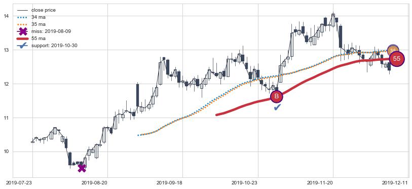 ⚄ 短期均线MA8上穿中期均线MA13形成的交叉是标准 黄金交叉