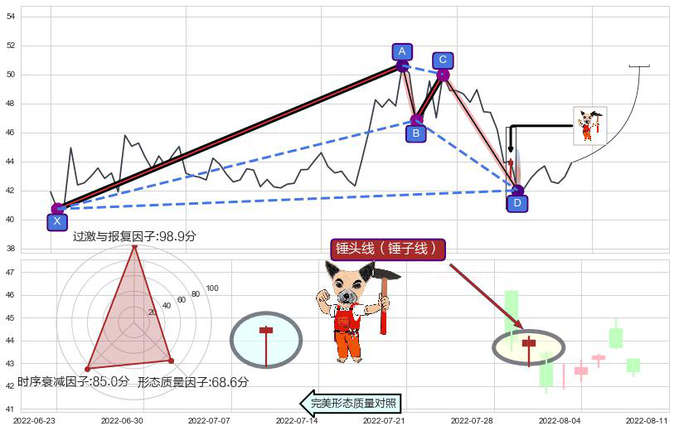 ➢ 锤头线(锤子线) 🔜 谐波蝙蝠d拐点上涨支撑 综合量化分数:53.77 【偏多】