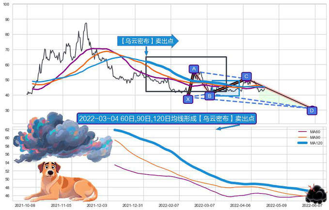 ➢ 【乌云密布】卖出点:乌云密布: 短期均线和中期均线纠缠粘合,长期均线始终在中短期均线上方压制
