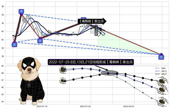 ➣ 【毒蜘蛛】卖出点:毒蜘蛛是均线组合看空信号,后市看跌,卖出信号