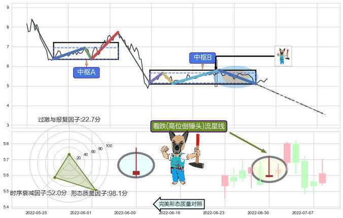 ➣ 看跌(高位倒锤头)流星线 + 缠论中枢点破位中枢B支撑下拉信号叠加后【目标达成率】中等,【看空】信号叠加【存续影响中等】
