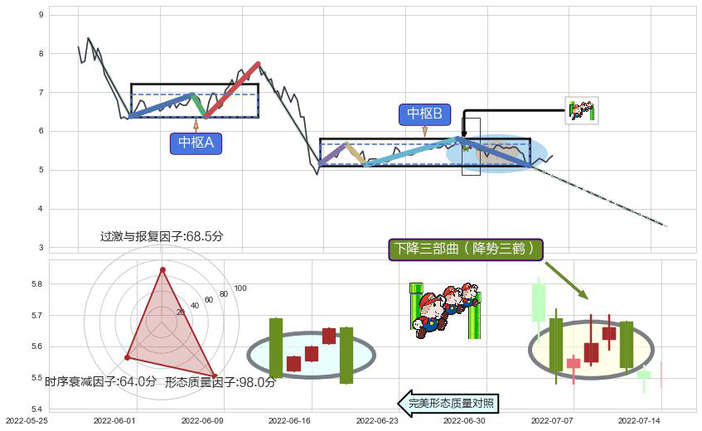 ➣ 下降三部曲(降势三鹤) + 缠论中枢点破位中枢B支撑下拉信号叠加后【目标达成率】低,【看空】信号叠加【存续影响大】