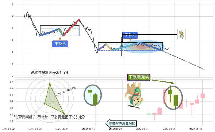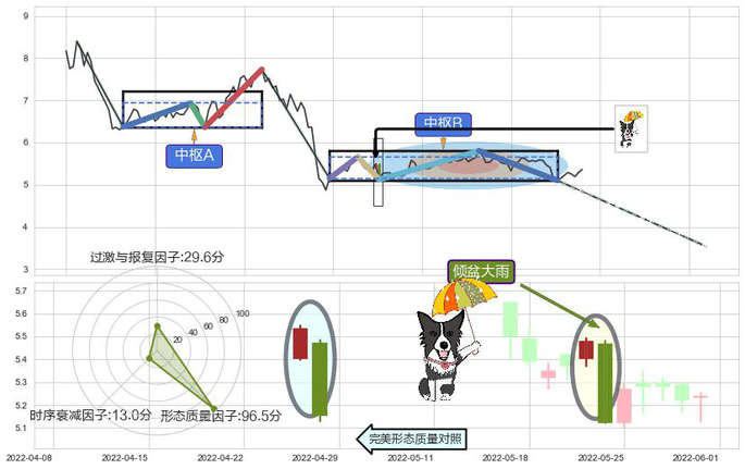 ➣ 下跌螺旋桨 + 缠论中枢点破位中枢B支撑下拉信号叠加后【信号初始稳固度】中等,【看空】信号叠加【可信度影响中等】