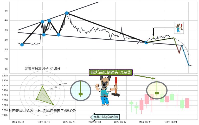 ➢ 🕰 价格走势在2022-06-15至2022-06-15期间形成看跌(高位倒锤头)流星线,残存影响值:-3.89