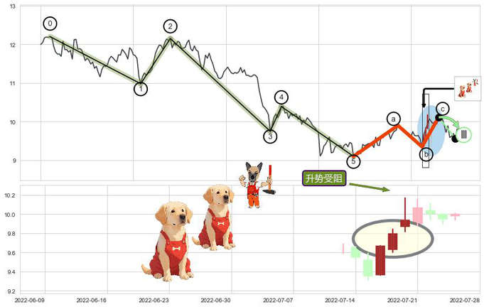➢ 波浪理论:猜想击穿突破c点后继续上涨 → 上涨 → 机会信号 → 小趋势跟踪