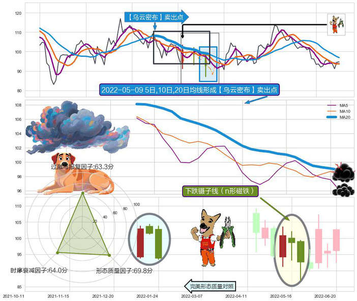 ➢ 下跌镊子线(n形磁铁) + 【乌云密布】卖出点乌云密布空头中继卖出点信号叠加后【反向回撤率】极高,【看空】信号叠加【存续影响极小】