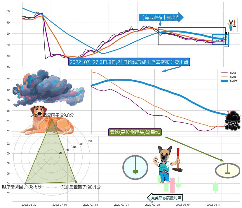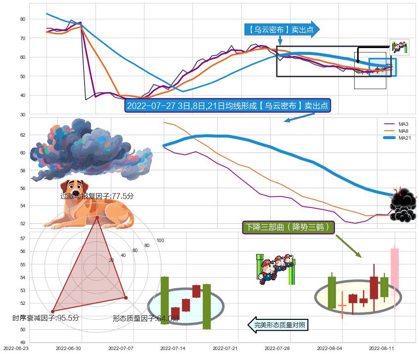 ➣ 2022-07-12日-2022-08-11日显现 3日-8日-21日均线 【乌云密布】卖出点 看空信号,后市看跌,卖出