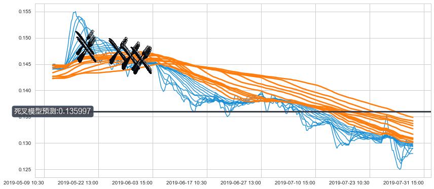 ➣ 120小时均线于(05-30 15:00: 0.145992)形成【死叉】基于【死叉历史模型】预测死叉后最低波谷价格: 0.134690, 死叉后最低价格0.124000,已经下跌超出预测最低波谷价格, 预期反弹