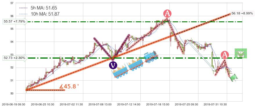 ♘ 阻力价格位52.73,可信任强度80.92%,距离最后交易2019-07-31 15:00形成的收盘价格51.55相差 +2.30%