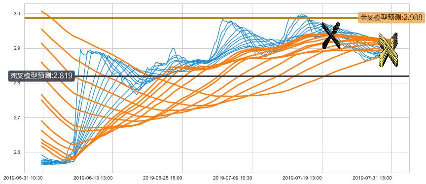 ➢ 40小时均线于(07-31 11:30: 2.889)形成【金叉】基于【金叉历史模型】预测金叉后最高波峰价格: 2.984, 金叉后最高价格2.910,尚未达到预测最高波峰价格, 预期继续上涨