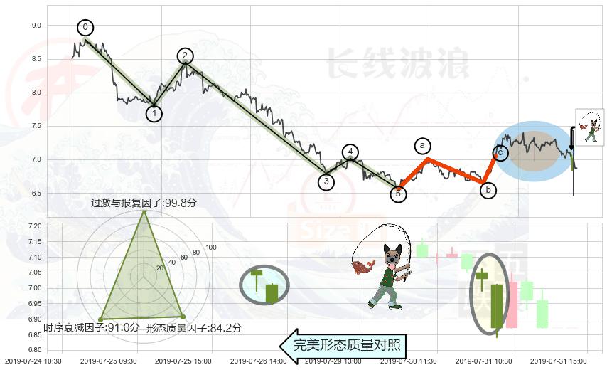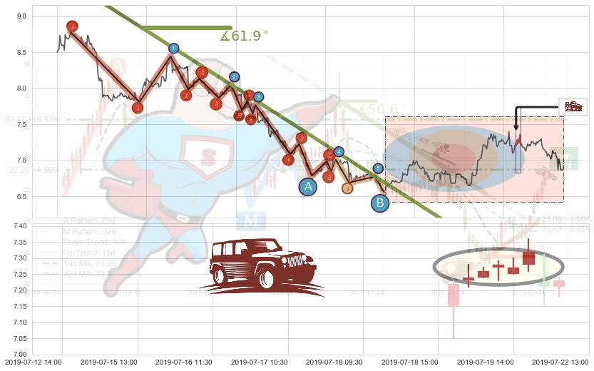 从2019-07-25 15:00至2019-07-31 15:00,共包含25个小时,阶段股价下跌-5.98%,阶段股价变动位移路程比: 1 : 2