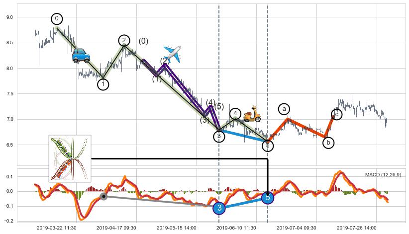 从2019-06-13 13:00至2019-07-03 10:30,共包含77个小时,阶段股价上涨1.93%,阶段股价变动位移路程比: 1 : 14