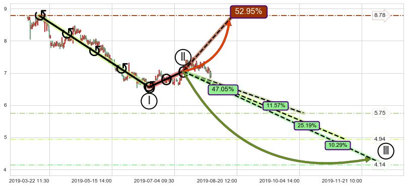 ➣ 下跌镊子线(n形磁铁) + 波浪理论c点反弹终止反转下跌信号叠加后【反向回撤率】偏高,【看空】信号叠加【存续影响降权】